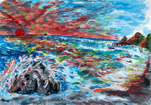 とても激しい感じの海岸沿いですね。小倉さんは高知の桂浜の海岸沿いをイメージしていると言ってました。そして小倉さんは私に坂本龍馬の存在も大きい桂浜だと言っていました。 日本が大きく変わろうとしていた時代のうねりを桂浜と坂本龍馬に重ね合わせて表現したのでしょうか?水平線には夕日が見えます。海には波のうねりと夕日から流れてくる赤い光が相まって激しさを強く感じます。そして波打ち際にある大きな岩に波しぶきが強く表現されています。 小倉さんの表現は表現主義的な自分の心にある見えないものを自分の外側に発散するような強さを感じます。決して写実的な表現ではありません。 自然の風景を基に描いているのですが、小倉さんの絵画はどちらかというと心の中に見えてくる心象風景に近いものでしょう。今回の絵は、とても激しくて厳しさを感じますが、そこから作者である小倉さんは激しい気性の持ち主とは限りません。 全ての人間に対して言えることは、人は心の中に他の人に見えない、見せないところが必ずあります。絵画はそういった見えない心の部分を解放して外にさらけ出すことができます。そうすることによって人は心のバランスを保つことも可能になってきます。美術だけでなく、スポーツの世界、普段の家庭の中においても、心の見えない部分を外に出す行為をしていることがあります。喜怒哀楽と言った喜び、哀しみ、怒りなども心があるからこそできることでしょう。美術ではそういった心を外に見せようとする表現は視覚表現ですからより強烈に感じるでしょう。 20世紀初頭に表現主義の表現が活発になりました。特にドイツでは表現主義の作品が大きく広まりました。時代背景もあると思いますが、もっと自由になりたいという芸術家たちが多かったせいかもしれません。小倉さんのこの作品を見て、表現主義絵画を再認識しました。小倉さんの日本に対する思い、そしてこの地域に対する思いと励ましを強く感じました。日本よ、もっと良くなるはずだ! 未来には希望があるはずだ!といった小倉さんの内なる言葉を聞いた感じがしました。
