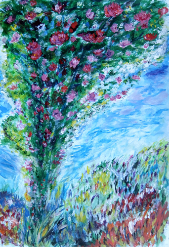 小倉さんの作品は色と筆のタッチがとても強烈で刺激的です。以前にも書きましたが、印象派的、フォービズム的な表現力を感じさせ、わくわくする表現になってきました。 今回はそういった刺激的な色使いと筆のタッチに加えて、作品構成(作品の組み立て)という面で更なる力強さをもった表現力を感じさせてくれています。 作品を見ると画面上部から下部に流れるアーチはバラ?の花が見られます?画面上部は手前に近づくように幅広くアーチを捉え(ほとんど鑑賞者の頭の真上にアーチが感じられるように描かれ)、画面下部はどんどんと遠ざかって細く見えるアーチの一部として画面を作っています。これはとても難しい画面構成の作り方ですが、画面のダイナミックさを表現する上でとても大事になる構成方法になります。 画面構成する上で考えなければならないことは、「流れ」があります。別の言葉で言うとハーモニーともいいますが、制作する時にどういった画面の流れを作るかを考える必要があります。ただ偶然にこうなったというのではなく、全体の流れをどう組み立てるかを考えながら制作課程を考えていくことは良い作品を創作する一つの条件になります。最初に画面全体の大きな流れをどうするかということを念頭に置くことも大事でしょう。その時に、画面に見えてくる形を意識しても良いかもしれません。 小倉さんのこの作品から見えてくる「流れ」というのは画面上部から下部に大きな流れですね。そして形でいうと上部が広く、下部が狭くなっていることから逆三角形という構成が感じられます。右側に描かれた小高い丘も少し小さめの三角形、左側の遠くに見える木の茂みも三角形です。全体の「流れ」を見ていくと、この作品構成は逆三角形の構図を基本にして制作されていることが感じられます。 画面構成する上で大事になるのはこの三角形の流れがとても大事なポイントになります。そしてその三角形が逆三角形であれば不思議と画面にダイナミズムを生む効果が生まれます。 小倉さんの新作はそういった構図のことを考えた場合、とても良い制作を経験したと感じています。そしてこれから更に刺激的で強烈なイメージを持った制作に進むのではないかと思っています。 全てを写実的に正確に表現するのではなく、その場の雰囲気、空気を大事にする印象派、フォービズムの醍醐味をかなり理解し始めている小倉さんの作品になってきたように思えます。そこに小倉さん独自の構図が見えると、ますます作品は光り輝くと感じました! よく頑張りました、小倉さん!