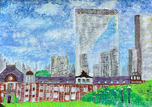 KONさんの新作は東京駅近くから見える都市風景のようです。大きく広がる空と高層ビル、そして東京駅の赤レンガ造りの建物のコントラストがとても良い感じに表現されています。 高層ビルの名前は私には分かりませんが、窓がミラー風になっていて他のビルと空が壁に映っているところにKONさんは驚きと魅力を感じ、絵として表現してみたいと思ったのでしょう。とても不思議な感じを包有した魅力ある風景ですね。 KONさんの作品が持っている大きな魅力は絵画の中にユーモア(ウイット)と優しさ感じられるところだと思っています。以前にも書きましたが、作品に温かいストーリーが感じられ、それが何故だか童話を読んでいるような雰囲気にさせてくれます。決して悲観するとかといったネガティブな気持ちにさせない、なんだか励まされる雰囲気があります。 そういった気持ちにさせられる要素とは一体何処にあるのでしょう。絵画は平面という2次元の世界に色と形が描かれて表現されます。それは抽象にしても具象にしても全く同じで、絵画表現の最低限の条件です。鑑賞者の目に映る色と形は私たちの心に何らかの方向性を持って様々な思いを見せてくれるのが絵画です。現実ではない(虚像)異空間の世界が私たちを誘導し、心豊かに変えてくれるのが絵画と思います。 KONさんの絵の特徴は描き方にその優しさがあり、その中でとても大きな特徴として、フリーハンドで描くことにあります。この絵の中でも分かると思いますが、高層ビルは少し歪んでいます。東京駅も正確というより歪みがあります。空に浮かぶ雲も、雲らしい描き方のみで正確な雲を描こうとはしていません。私はKONさんが続けているフリーハンドの描き方が作品の優しさ、温かさ、ポジティブな思いを伝える大きな特徴があるのかなと思いました。 最後にこの作品の中にほんとのに小さな小さな赤い風船が描かれています。皆さん何処にあるか見つけてくださいね!