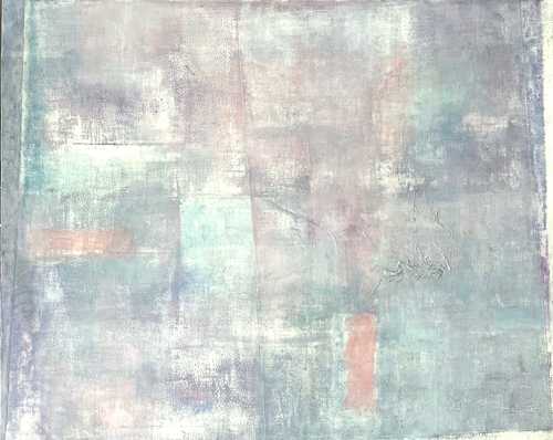 高橋さんの新作はより一層、~わびさび~の雰囲気を醸し出してきました。画面を構成する形態は高橋さんがモチーフとして使用するシンプルな抽象的な形(幾何学形)が所々に見られます。今回の新作はそのモチーフである形態を画面から剥ぎ取っていくような技法が見られ、画面から見えてくる風情は朽ちていくモノに対しての愛おしさ、心の中に生ずる哀れみというものが感じられます。この感覚は日本独特のものでしょう。 西欧、或いはアジアの国々においては古いものに対して愛おしい感情を持ち、そこに美を感じるというより、常に新しいものに憧れ、新しさに美を求める感覚がより強いと思います。そういった流れでも欧米にも日本的なモノの見方、考えに影響された芸術家もたくさんいるのも事実です。スペインの芸術家であるタピエスもその一人かなと思います。またイタリアの画家のモランディから感じられる雰囲気にも似通ったものを感じます。高橋さんの作品にはタピエス、モランディの作品のような雰囲気を醸し出しているようにも感じています。画面、右側に少し盛り上がったマチエールが見られます。和紙を画面に貼り付けた跡のようです。高橋さんは以前、「このキャンバスを使って作品を描こうとし、和紙を表面に貼り付けていった痕跡がそのままこの場所に残ってしまった、そしてそれを今の作品の一部として使ってみた」と言っていました。このキャンバス自身には長い時間的な流れを含有している軌跡があるのでしょう。以前作品として使われたキャンバスを、少しの痕跡を残し、その痕跡を新しい作品の一部として再表現の一部にする。こういったプロセスも画面から感じられる「わび、さび」の印象に大きく影響しているような気がします。 全て計画的に構成され表現されているわけではなく、時間の流れの中で移ろいゆく表現の曖昧さが上手く美しさと響き合ったのかなと思います。日本語に「無情」という言葉があります。永遠に不変であるものはなく常に移り変わっていくはかなさの中に一瞬の美を感じる意識というのでしょうか~。高橋さんの作品にはそういった感覚を呼び起こされます。高橋さん自身は「まだこの作品は完成しているわけではなく、まだ不十分に思える箇所がたくさんある」と言っていました。私は逆にこの不十分に感じられるところにも、もしかして「わび、さび」の感覚があるような気もしています。秀作ですね!