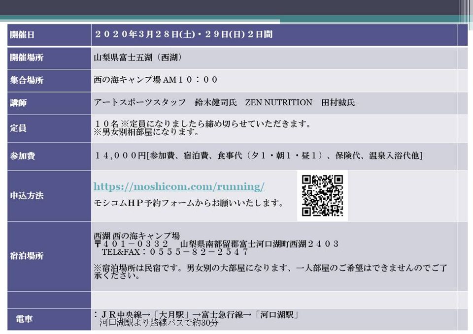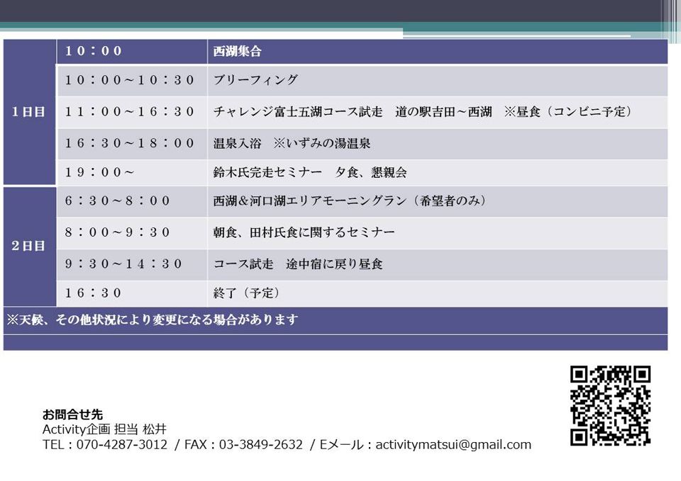 開催場所は山梨県富士五湖西湖、初日はコースの試走、完走セミナー、2日目は食に関するセミナー、コースの試走。皆様のご参加をお待ちしております。
