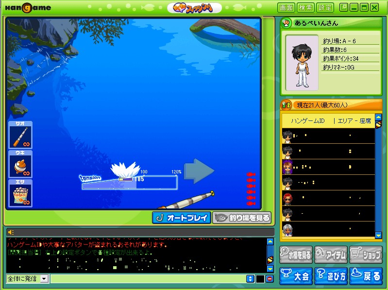 お疲れ様です、アルベインです。今日はショートコース行く予定が延期になってしまったため暇だったので近くの美容院へ行って散髪してきました。やっぱさっぱりしてるほうがいいね。゚+.(*`・∀・´*)゚+.゚イィ!!夏なのでちょっと短めにしてみました^w^なんとなくハンゲに行って遊んでましたわ^w^フィッシングとかあったのでちょっとやってみたり・・・釣れるとこんな感じね ((´∀`*))評価:4点(10点満点中)多分初心者でも簡単にプレイできると思われます。暇つぶしくらいにはなるかな??個人的には単調すぎて、さすがにすぐ飽きそうです^w^;;;;評価:6点(10点満点中)なんとなくチョコットランドで遊んでみたり( ̄m ̄〃)グラはカワイイ系ですね。人もそれなりにいたのでちょっと気になってプレイしてみました。お気軽プレイできるかなと思ったんですけど、何気にマゾいゲームだったりします。ちょっと序盤の装備収集がかなり厳しいんじゃないかなコレwwwやるなら他の人と一緒にすることをオススメします。初心者ソロは厳しいベ^w^;;;あ、明日は宝塚記念なので賭けようかなぁとか思ってます^w^んじゃまた(゚ω゚)ノ