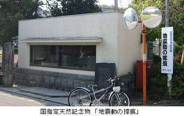 「南関東低山つなぎの旅2日目」のルートを国土地理院の地形図で検討していたとき、「地震動の擦痕」という記載が目に止まりました。・・・で当日、その「サッコン」なる場所に立ち寄ってみました。「地震動の擦痕」という名称から、地震によって地表に現れた断層面のようなものを想像していたのですが、そこにあったのは全く別物・・・コンクリートの小屋に展示された、ガラス越しに見る「魚雷」でした。解説文によると、「魚雷は忠魂碑建設のため、時の海軍から下付されたもの。昭和05年11月26日の北伊豆地震で、台石が魚雷の腹を削り擦痕を付け、自然の地震計となった。昭和09年01月22日、天然記念物に指定された」とのこと。「なんでこんなものが国指定の天然記念物に?」と思ってしまうところですが、昭和ひとケタという時代背景を考えると、納得できるような気もしました。(魚雷の写真はこちら)