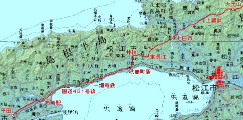 2008年05月04日(日)快晴のち曇 05:00起床、フクラハギに筋肉痛が残っている。朝食は惣菜パンとカップスープ。テントを仕舞い、05:50大平山を後にする。雑木林のそこら中から野鳥のさえずり。下山しているにもかかわらず、足取りが重い。06:30上講武の人里まで下り着く。北南の山並みに挟まれて、水田が続く。今は田起し・水張りの時期。姿は見えないが、カエルの声が響き渡る。08:00七日市で県道37号線、コンビニ「ポプラ」で「レモン水」1Lを調達する。昨日のコンビニもポプラだった。この辺りはポプラの勢力範囲らしい。 東長江で宍道湖北部広域農道に出る。宍道湖岸を走る国道431号線は交通量が多そうなので、この農道を行く。ところが歩いてみると、地図で見るよりアップダウンがずっとある。計画変更、井神から宍道湖岸へ南下する。日差しが強くて5月とは思えない暑さ、レモン水が見る見る減ってゆく。10:00一畑電鉄秋鹿町駅でひと休み。思ったとおり、431号線は引っ切りなしに車が通る。国道を避け、できるだけ旧道を利用する。宍道湖の水は淀んだ灰色、涼しさを運んで来てはくれない。昼時が近づいても、暑さのためお腹が減らない。ポプラで今日2L目のレモン水を購入。昼を過ぎて薄雲が広がりだし、湖岸の道が終わる。道端に座り込んで休む前を、2両編成の一畑電鉄が走り過ぎる。平田につながる湯谷川も宍道湖同様に淀んで、どちらが上流なんだか分からない。 14:20今日の終点・平田の「ビジネスホテル幸野屋」に到着。チェックインは16:00とのことで、荷物だけ置かせてもらい、食料調達などで時間を潰す。入浴・洗濯を済ませ、夕食は肉じゃが弁当と助六寿司。テレビを見ていたら、出雲市の最高気温が今年初めての30度で、真夏日だったとのこと。暑かったわけだ。「ビジネスホテル幸野屋」、素泊4300円。大平山→平田:29.8km(中国一周徒歩旅行累計270.9km)