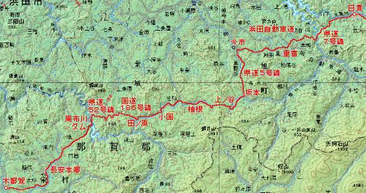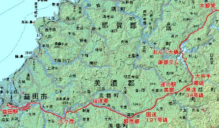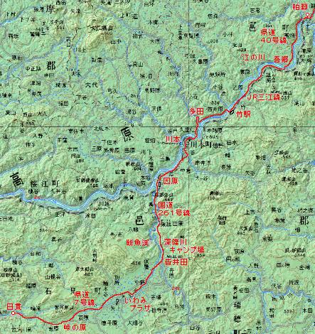 2008年05月09日(金)曇 05:00起床、惣菜パンとジュースで朝食。06:00「観月旅館」を出発する。今日が今回の旅の最終日、終点の益田駅までは35kmほど。昨日まで3日連続して晴れだったが、今朝は曇り空。木都賀を出ると10km以上集落のない寂しい道が続く。たまにある谷川沿いの人家も、無人だったり廃屋だったり・・・。07:25ダム湖に架かる「おんべ大橋」で対岸に渡る。ひと気のないダム湖を通ると思い出してしまう、・・・殺人犯が重りを付けて死体を沈めるニュースを。そんな感じの場所だ。こういうところで野営するような計画は、立てない。寂しい道は大井手集落で終わり、08:30県道34号線に出る。郷組集落でひと休み。目の前を数百mのループを描いて、県道が高低差50mほどを上っている。車なら楽に上れても、歩く方には何とも迷惑なループである。ちょうどやってきた農作業のおじいさんに、ショートカットできる脇道がないか聞いてみる。「そこの家の脇、行ったらいい」。教えられた通り草深い急斜面の小道を直登すると、容易に上まで出られた。聞いてみるものだ。トンネルを抜け、09:15「道の駅美都」でジュースを調達。ここから先は国道191号線を一路益田に向かう。広島と日本海側をつなぐ191号線は利用価値が低いのか、交通量が少ない。ここを歩く者もそんなにいないはずなのに、歩道は広く取ってある。こちらにとっては好都合な国道である。時間に余裕があるので、頻繁に休憩しながらのんびり歩く。 利用する車が少ない国道だけあって、沿道に全然商店が見つからない。食料の持ち合わせがないまま昼時が近づく。益田に着くまで昼食はお預けかと諦めかけていると、前方に見覚えのある赤い看板、・・・11:45仙道郷でコンビニ「ポプラ」を発見。ナイスタイミングだ。ハンバーグ弁当とレモン水を購入、店の前で昼食にする。14:05国道を折れ、益田市内に入る。市街地を避けて益田川沿いを行く。15:00益田駅に到着。事前に調べておいた益田唯一の銭湯「にしき湯」でゆっくり汗と埃を流す。夜行バスの時間まで餃子屋と居酒屋で時間潰し。18:45益田駅前発の石見交通「いわみエクスプレス」に乗車、翌朝07:15新宿駅新南口に着く。中央線・総武線を乗り継ぎ、07:50自宅に帰り着く。木都賀→益田駅:34.7km(中国一周徒歩旅行累計450.0km)この続きは、来年のGWを予定しています。