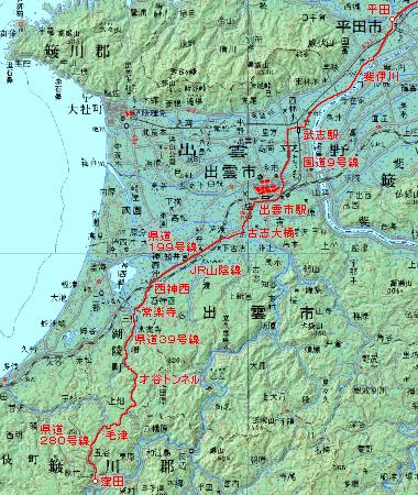 2008年05月05日(月)曇一時雨 05:00起床、朝食は菓子パンとココア。05:55「ビジネスホテル幸野屋」を出発する。小雨降る平田の町を抜けてしばらくで斐伊川(ひいかわ)。土手の「出雲路自転車道」を出雲市に向かう。広々とした河川敷も天気がよくないと、何だか寒々とした感じ。5kmほどで土手を降り、07:25一畑電鉄武志駅にてひと休み。雨は止んでくれる。出雲市街地への途中、「ポプラ」でパンとレモン水を調達。国道9号線を越え、08:25出雲市駅南口。この駅は北口が表玄関なので、南口は殺風景に見える。古志大橋で神戸川(かんどがわ)を渡り、JR山陰線に並行する県道199号線を南西へ。南風が強い。西神西(にしじんざい)で県道を離れる。10:40常楽寺集落、パンとレモン水で昼食休憩。靴を脱いで足を解放する。南へ向かう県道39号線は常楽寺川に沿う谷間の道、人家も交通量もぐっと少なくなる。2004年開通の才谷トンネル手前から旧道に入り、峠越えの上り。地図に載っていない枝道に道標はなく、稀にしか来ない車を止めて道を教えてもらう。12:55毛津集落、再び雨が降り出す。集会所の軒先、ベンチだけのバス停で雨宿り。昨日の真夏日とは打って変わった寒さ、体が冷えてくる。どこか適当な場所があったら、予定地より前でも野営しよう。県道280号線を下り、14:00窪田集落。酒屋で飲物を買うついでに、野営できそうな場所を聞いてみる(本当は飲物の方がついで)。「隣に広場があるけど、そこなら大丈夫じゃない?」と店番の奥さん。行ってみると、公民館・神社・神社の寄合所がある。水道と水洗トイレもある。今日の野営地決定。 寄合所の軒下にテントを設営する。ココアで温まり、ラジオを聞きながら寝袋に。17:00近所のお寺から鐘の音、雲が晴れて青空が見えてくる。夕食はレトルト中華丼とインスタント味噌汁。今夜はかなり冷えそう。平田→窪田:31.3km(中国一周徒歩旅行累計302.2km)