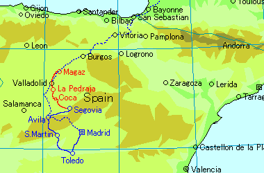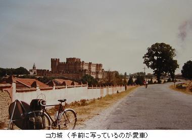 19XX年08月04日(木)前日、Segovia のレストランで'Castillo de Coca'(コカ城)と書かれた写真を見たとき、「あっ」と思った。この城・・・・実家にある百科事典の「城」の項目に、カラー写真で大きく載っていたのと同じだ。Segovia の近くにこれがあるんだろうか?'FIRESTONE'の道路地図を調べてみると、'Coca'という地名があり、'Castillo de Coca'の記載もあった。Segovia からそんなに遠くない。Segovia を発ち、Burgos へ向かう。Burgos までは自転車3日の距離。少し寄り道して Coca を訪れる。城は難なく見つかる。子供の頃に見ていた百科事典の城、こんな形で実物に出会えるとは・・・・。この日、La Pedraja という集落の近くの林にテントを張って野営する。スペインでは宿代が安いので、これまでテント・寝袋の出番がなかった。スペイン旅行中にテントで寝たのは、これが最初で最後であった。