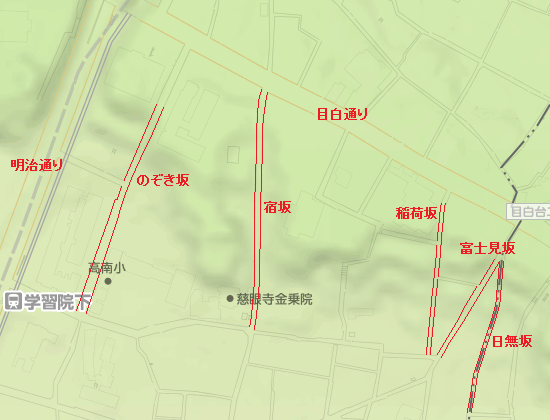 2018年01月25日(木)快晴日本の上空に今季一番の強い寒気が流れ込み、気象庁は東京地方全域に33年振りの低温注意報を発表した。今日の都心の最低気温が-4℃、最高気温が4℃。3日前に降った雪が、あちこちでガチガチに凍結している。今回歩くのは、豊島区の高田1~3丁目。09:45 都電早稲田駅 、【 東京歩きめぐり 第99回 】を歩き始める。高田の町名は、神田川による侵食でできた急傾斜面の耕地に由来するらしい。地名用語の「タカ」または「タケ」は、崖や急傾斜面を意味するという。その急傾斜地は高田1~2丁目に見られ、そこには名前の付いた坂が5つある。東から順に坂めぐり。「日無坂」を上る。上部は階段路地。樹木が生い茂り日中でも日が当たらなかったことから名付けられたとされる。日無坂上から「富士見坂」を下る。昔 坂上から富士山が見えたのが坂名の由来。現在 富士山は見えないが、新宿の高層ビルを遠望できる。富士見坂下から「稲荷坂」を上る。坂上にある稲荷の祠が坂名の由来。「金乗院」を訪れる。境内の「目白不動」の本尊は、関口駒井町(現在の文京区)にあった新長谷寺が戦災で廃寺となったため、当地へ移されてきた。「倶梨伽羅不動庚申塔」は 1666年(寛文6年)建立。金乗院前から「宿坂(しゅくざか)」を上る。練馬方面から江戸へ行くのにここで1泊しなければならなかったことが、坂名の由来という説がある。解説板によると、中世の頃 この辺りに「宿坂の関」と呼ばれる関所があったと伝わり、1836年(天保7年)出版の「江戸名所絵図」には「宿坂関旧址」の文字が読める。「のぞき坂」を下る。東京で最も急な坂と言われるらしいが、「さもありなん」と思える勾配。坂の途中からのぞかないと坂下が見通せないため、この坂名が付いたという。神田川近くに「山吹之里」碑が建つ。太田道灌「山吹の里」の故事の舞台については、他にもいくつか候補地がある。「高田總鎭守 氷川神社」を訪れる。理由は不明だが、境内での撮影は禁止。撮影を禁止しなければならないほど有り難い神社なのだろう。11:15 学習院下交差点 、【 東京歩きめぐり 第99回 】はここで終わり。都電早稲田駅 → 学習院下交差点 : 6.2 km