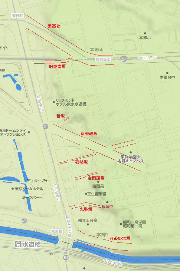 2018年12月06日(木)雨冷たい雨が降っている。今回歩くのは、文京区の本郷1丁目。08:55 水道橋交差点 、【 東京歩きめぐり 第122回 】を歩き始める。本郷の町名は、かつて湯島郷の中心地であったために湯島本郷と呼ばれていたのが、のちに本郷と呼ばれるようになったとされる。本郷1丁目をめぐる。この地区には、西から東へ本郷台地に上る坂が数多く存在する。「お茶の水坂」を上って下る。坂名は、かつてここにあった高林寺の湧水が「お茶の水」として将軍に献上されたことに由来する。坂の途中に「神田上水懸樋(掛樋)跡」の石碑がある。江戸時代 神田川に木製の樋(とい)を架け、神田上水の水を通し、神田・日本橋方面に給水していた。「忠弥坂」を上る。坂名は、坂上にあった丸橋忠弥の槍の道場に由来する。1651年(慶安4年)忠弥は由井正雪とともに江戸幕府の転覆を企てたが、露見して処刑された。「金毘羅坂」を下る。坂名は、南側にある金刀比羅宮 東京分社に由来する。その「金刀比羅宮 東京分社」を訪れる。神社は讃岐高松藩松平家の邸内社を起源としている。讃岐は金刀比羅宮のあるところ。「壱岐坂」と「新壱岐坂」を上って下る。坂名については、小笠原壱岐守の屋敷に由来する説と彦坂壱岐守の屋敷に由来する説がある。新壱岐坂は、関東大震災の復興計画により昭和になってから開かれた坂道で、古い壱岐坂を途中で分断している。階段坂の「新坂」には、「外記(げき)坂」という別名がある。坂上にあった旗本 内藤外記の屋敷に由来する。幕末の切絵図に「ケキサカ」「内藤肥後守」とある。「出世稲荷」を訪れる。3代将軍 徳川家光の乳母 春日局がこの地を拝領した際、鎮守のため勧請したと伝わる。春日局の出世にあやかり、出世稲荷と呼ばれるようになったといわれる。「旧東富坂」と「東富坂」上って下る。木が生い茂り鳶(とび)がたくさん集まってくることから鳶坂といい、いつの頃からか富坂と呼ぶようになったとされる。小石川台地の富坂(西富坂)に対し、白山通りを挟んで本郷台地に上る坂を、東富坂として区別している。現在の東富坂は、明治時代に路面電車を通すにあたり、新しく開いた緩やかな坂道。10:05 新壱岐坂上 、【 東京歩きめぐり 第122回 】はここで終わり。水道橋交差点 → 新壱岐坂上 : 3.9 km