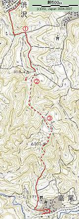 国土地理院の地形図を検討してみると、渋沢から高尾に抜けて曽我丘陵へ向かうのが、最も都合の良いルートであると分かりました。この間、直線距離で約2.5km。実線(幅員1.5~3m)と破線(幅員1.5m未満)でつながっている様に表記されています。