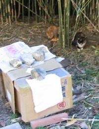 道の反対側から「ミャーミャー」鳴き声・・・・見ると、日当たりのよい場所に猫が2匹。こいつらの家のようです。誰かが野良猫達のために「ねぐら」を作ってやったのでしょう。