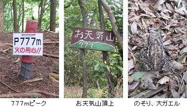 尾根を歩いているのだが、景色のよい場所はない。777mピークを越え、岩稜の裾を巻いて最後の登り。10:55お天気山頂上(777m)、ここも展望はない。かなりの強行軍で来たおかげで、バスの時間に間に合いそうだ。