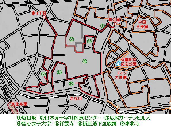 佐倉藩下屋敷跡地には現在、日本赤十字社医療センター・広尾ガーデンヒルズ・聖心女子大学などがある。大正5年(1916年)久邇宮邦彦王(くにのみやくによしおう)は当地に屋敷地を下賜され、宮邸を構えた。昭和22年(1947年)にその跡地を購入した聖心女子大学には、宮邸の御常御殿(おつねごてん)・正門などが残っている。香淳皇后(昭和天皇の皇后)は邦彦王の第1王女。