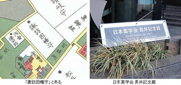 切絵図に「諏訪因幡守」とあるのは、信濃国諏訪藩諏訪家(3万石 譜代)の下屋敷。明治21年(1888年)日本の近代薬学の草分けである長井長義が下屋敷跡地を購入、邸宅を構えた。江戸時代の長井家は、代々阿波国徳島藩主の典医を務めていた。現在、長井邸跡地の一部は「日本薬学会 長井記念館」になっている。