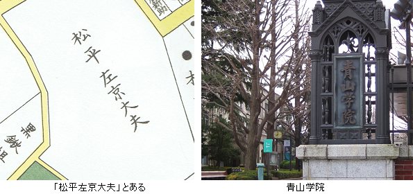 切絵図に「松平左京大夫」とあるのは、伊予国西条藩松平家(3万石 親藩)上屋敷。寛文10年(1670年)紀州藩初代藩主徳川頼宣(家康の十男)の三男松平頼純が西条に入封、西条藩は紀州藩の支藩と位置付けられた。廃藩置県まで10代にわたり、西条松平家が藩主を務めた。現在、上屋敷跡地には青山学院大学・高等部・中等部・初等部がある。09:00 青山学院前 、【 江戸切絵図歩きめぐり 第76回 】はここで終わり。