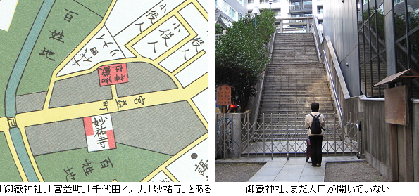 切絵図にある「御嶽神社」は、元亀元年(1570年)創建と伝わる。ビルの2階屋上に鎮座するが、まだ入口が開いていない。社殿前の狛犬は、イヌではなくニホンオオカミ。ブロンズの狛犬は複製で、延宝年間(1673~81年)に造られたというオリジナルは社務所で保管されているらしい。
