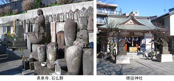 切絵図にある「長泉寺」を訪れる。源義家に従って奥州討伐で軍功をあげた秩父平氏の河崎基家により、康平6年(1063年)に創建されたと伝わる。墓地の奥に二百数十体もの石仏が並んでいる。かつてこの近辺で祀られていた地蔵などが、宅地造成などの際にここへ集められたきたという。
