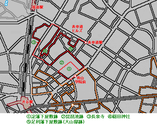 明治23年(1890年)大山はドイツの古城を模したといわれる煉瓦造三階建の洋館を新築、明治天皇が行幸した。大正12年(1923年)に起きた関東大震災によって倒壊するまで、この洋館は大山家の生活の場だった。08:55 表参道駅 、【 江戸切絵図歩きめぐり 第77回 】はここで終わり。
