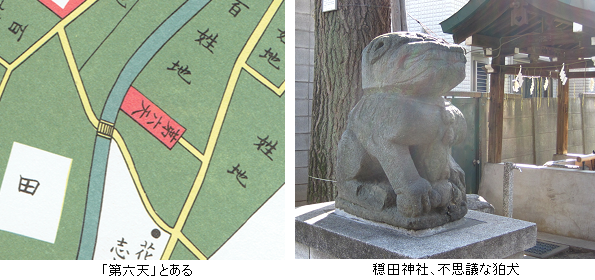 穏田神社には社殿前の狛犬とは別に、手水舎近くに不思議な狛犬が置かれている。​ 神社のHP ​によると、この狛犬は小松輝久侯爵(北白川宮家出身の皇族)邸(現在の青山学院初等部)にあったもので、戦災に遭って移設されたという。出自について、朝鮮半島から来たものと推定されている。