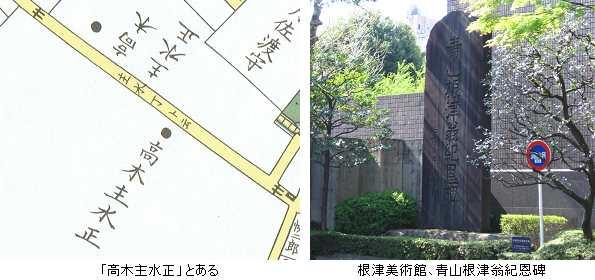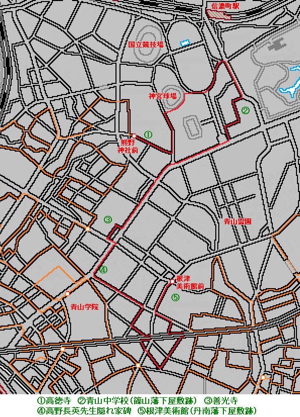 切絵図に「高木主水正(もんどのかみ)」とあるのは、河内国丹南藩高木家(1万石 譜代)の下屋敷。明治39年(1906年)東武鉄道の社長などを務めた根津嘉一郎が丹南藩下屋敷跡地を取得、広大な日本庭園を持つ邸宅を構えた。現在、根津邸跡は「根津美術館」になっている。09:00 根津美術館前 、【 江戸切絵図歩きめぐり 第79回 】はここで終わり。
