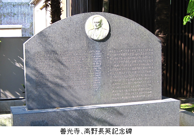善光寺境内に「高野長英記念碑」がある。医者・蘭学者だった長英は、天保10(1839年)年に蛮社の獄で投獄されたが、伝馬町獄舎の火災に乗じて脱獄、以降6年にわたり各地を潜行した。嘉永3年(1850年)善光寺近くの隠れ家に潜伏していたところを幕吏に捕縛され、自刃した。