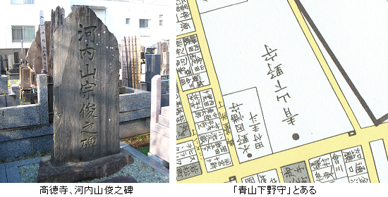 北青山1~3丁目。切絵図にある「高徳寺」を訪れる。ここには講談などで知られる河内山宗春の墓があるとされるが、石碑(名前が宗俊になっている)しか見つからなかった。宗春は江戸時代後期の表坊主(江戸城内で大名や諸役人の雑用に従事する職名、僧形となる)。水戸徳川家を恐喝して捕えられ、文政6年(1823年)に獄死したとされる。
