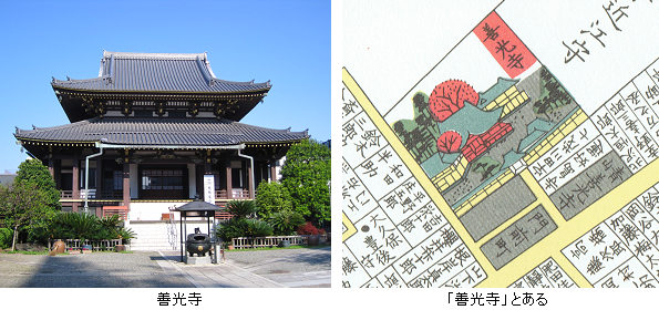 切絵図にある「善光寺」を訪れる。慶長6年(1601年)信濃善光寺の分院として谷中(現在の台東区谷中)に創建されたが、元禄16年(1703年)地震による大火に遭って焼失したため、宝永2年(1705年)現在地へ移転した。