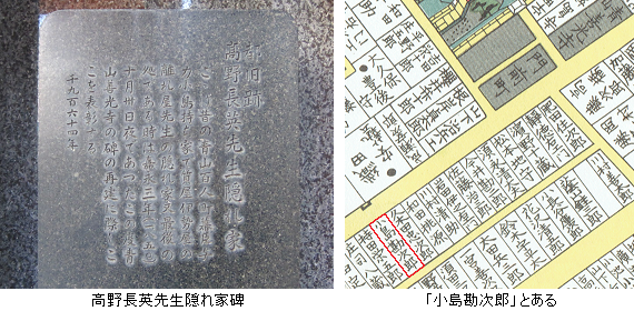 南青山5~7丁目。高野長英終焉の地に「高野長英先生隠れ家」碑がある。青山百人町(現在の南青山5丁目)に幕臣与力小島家の持ち家である質屋伊勢屋の離れがあり、ここで長英は偽名を使って町医者を営んでいた。その小島家が、切絵図には「小島勘次郎」とある。