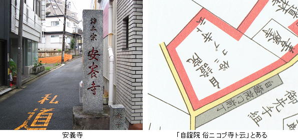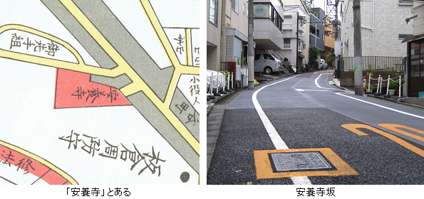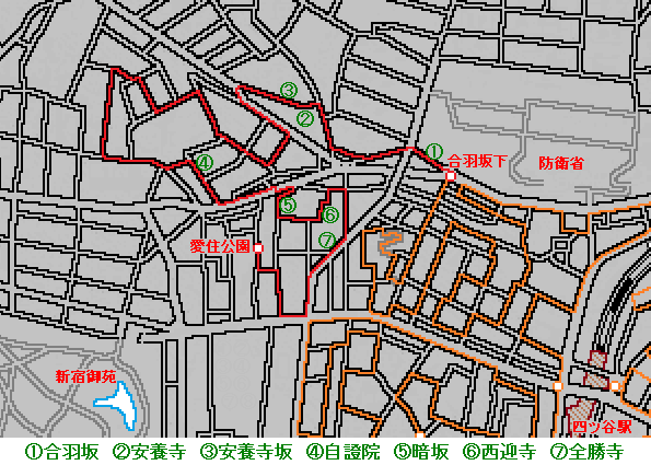 切絵図に「安養寺」とある。その北側の「安養寺坂」を上る。安養寺は天正2年(1574年)創建。市谷佐内町富士見坂辺りにあったが、明暦2年(1656年)尾張藩上屋敷の囲い込みにより寺地明け渡しとなり、現在地へ移転した。