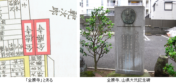 全勝寺には江戸時代中期の尊王思想家である山県大弐の墓所と記念碑がある。著書で尊王論を説いたり幕政批判を行ったりしたため捕えられ、明和4年(1767年)伝馬町の獄舎で刑死した。08:35 愛住公園 、【 江戸切絵図歩きめぐり 第90回 】はここで終わり。