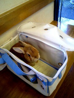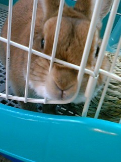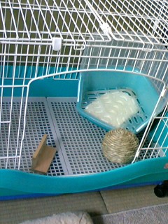 夜になると「お部屋にだしてくだしゃ~い」と懇願してケージの扉をカジカジする師匠。目はひん剥くし、カジカジの後にオクチをもぐもぐ。。。そしてひと回りした後は「必ずダンナさんの足元へ!!」「カクカク大好き攻撃!!」(オトコ好きなの?ポコちゃん??)しかもカクカク攻撃率は圧倒的に私よりダンナさんへ・・・ま、何かが誘ってるんでしょうかね・・・そんな行動に出たいが為にするカジカジっての後のオクチモグモグで歯が少しづつ削れちゃってるんじゃないかって心配してます。以前教えていただいたアクリル板をつけてみる・・・。も考えましたが「穴あけのキリ」がない。お手軽に出来る何かは無いかと。 そ し た ら !!ありました~♪とっても簡単。ケージカバーを全部掛けちゃうことです。前の部分を全部かぶせると諦めました。冬はもともと寒さ対策に掛けていたんですが前の部分は上に上げて見えるようにして居ました。とりあえずひとしきり脱走しまくって「もうおうちに帰ってね」と言う時にケージにポコが入った後かぶせます。すると「あ、もうカジカジしても無駄なんでしゅね」(ポ)とすんなり諦めておとなしくなります。私たちが寝る頃、前のカバーをペロっとめくってあげる頃にはすっかり元の穏やか師匠に戻っています。なんか「チャラララララ~♪」のマジックショーみたいです。家にあるもので特に手を加えずおとなしくなってくれてよかった。よかった。・・・・・・でも、暑い時期はカバーかぶせられない・・・。 ま、そのときはそのときに考えます。(by脳天気)********************************************************************前回の日記のコメント欄で「この雛うさぎは私の物にしようかとモクロミ中」と書いたら・・・こっそりこの日記を読んでるダンナさんが夕べ・・・どちらかを娘と私で分けるようにと「雛うさぎ2」を買って来てくれました♪ (でも、これも私にですか・・・?おほほほほ・・・)*注 今クレームが旦那さんより入りました。(私書箱に入ってました) このコメントを見る前から買ってあったということを「強調してくれ!」と・・・ コメントに書いてくれればいいのに。。。 (と、こんなところで私も反論) 娘は「花より団子」なんですよね。。。
