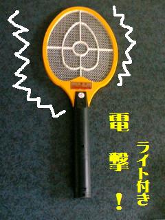 梅雨入りも間近・・・食べ物も腐りやすい今日この頃・・・部屋の中にはちょっと窓を開けっぱなしにすると小さい虫とかハエとか入ってきたりしませんか?(なんだか通販番組のような言い方。)殺虫剤やりたい時もあるけど、なにしろ「ポコ」と「もんずぃ~」がいますからね~かといって叩き潰すのがうまくいかない時がほとんどでイラつき度up!さっき薬局にで行ったら・・・あったんです前から気になってた「コレ」が!その名も・・・「ムシコロラケット(ライト付き)」!「電撃!」らしいですよ。ふふふ・・・タノシミだわ。早く部屋の中に迷い込んでこないかしら・・・虫。ま、こういうものは買ってもイマイチ的なものが多いんですけどね。元とれるくらい活躍していただかないと・・・!今日から我が家は、ご家庭版「エースをねらえ!」ですわ~ママ 大ハリキリでしゅね~(ポ)
