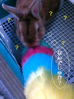 うさひくひくさんのうちの「うさおクン」の愛するポン太くん・・・うちにもド派手な「虹子(にじこ)ちゃん」がいましたっけ。ってな訳で。。。ご対面~ん「なんでしゅか???コレ???」(ポ)「虹子ちゃんだよ~」(マ)「なんでしゅか~・・・じゃまくしゃいでしゅね。。。」(ポ)興味なし・・・ってか「キライ」。。。やっぱりこうみたいです。↑