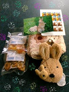 先日見事40000hitを迎えられた「楽天ブログうさ飼いさん」界のHideyonさん から、前後賞をいただいちゃいました。うちの「もんじ」は遥かかなたからうちにやってくる「よそ様」の足音にものすご~く敏感で私にはとうてい気づかないくらいの音の時からものすごい声でワンワン吠えます。そして・・・「ピンポ~ン」「もんじ~!うるさいよ~!」と、いつものようにしかりながら玄関へ・・・。そして。。。♪いただいちゃいました♪ウレシー!!そしてご連絡を頂いた時にあつかましくもお願いしてしまったモモヤンとぱんちょ君の「奇跡のツーショット!」そして~ポコの写真をプリクラにしてくれた物までいただいちゃいました家族そろってモモヤン&ぱんちょ君のファンである我が家は大喜びでございます♪有難うございました~*ちなみに○○さんは「奇跡のツーショット」とはHideyonさんのお膝の上に乗ったモモヤンのお写真だとカンチガイしていたらしいです。(残念!)でも、私もHideyonさんのお顔見てみたいわ~・・・