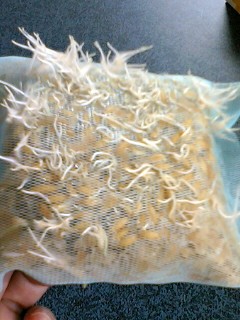いかにも梅雨なのでカビてしまわないかと心配な期待の星「ごち草」クン!23日(金)に栽培開始してからですね。。。驚異的なスピードで成長中のようです。なにしろ2日目には白い根っこがチラホラ見え始めていましたから。。。そして本日26日撮影裏側です!も~びっくりですよ。モサモサです。まるでアルファルファのようです。見えますか?こちらが表です。すこ~し芽が出てきました。そろそろ外に出してもいいかも。天気はイマイチですが家においておくよりはですよね。 。。。。そして、その「ごち草」をお待ちのあの方。。。今や「大好き!冷え冷え♪」になったおかげで心なしか楽しげそして相棒の「お皿」「リンリンちゃん」にも涼しさのおすそ分けは忘れません。ポッコリーニさんの日記で発覚以来毎日のように繰り返す配膳「キチョーメンですな~」(ママ)そしてその間自分は・・・・「いいんでしゅ。ここで寝てましゅから。」(ポ)謙虚なのかどうなのか・・・ま、自分がいいならいっか。