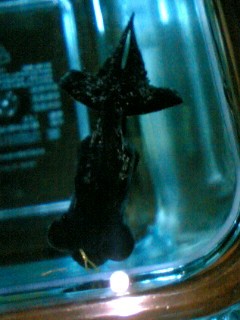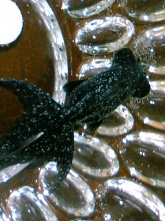 白点病になってしまった金魚のデメ子今日は朝から非難用のサラダボールに水を作り食塩を入れて(白点病には食塩水でも可と書いてあったので)デメ子を非難させました。元気だったデメ子も今朝見たときには水槽の中で動かなくなっていたので、それに比べればサラダボールの水の中ですいすい泳ぎ回るようになりました。その間に水槽を洗って・・・新しい水を作り、食塩を大量に投入(水1リットルに対して0.6%の塩らしいので12リットル水槽にはかなり入れないと・・・ですね)こんなに白い点々がついちゃいました・・・少しでも良くなるといいけど。。。そんな時、お隣に居を構える「P」師匠「ここからここまではボクの場所でしゅからね!」(ポ)・・・だれも取りませんから~・・・話は変わって・・・お使いに行った娘が買って来た「チョコベビー」。最近ってたくさん入っているチョコの何粒かの中にの模様が入っているものが紛れているんですね~(知らなかった。)いろんな隠し技があるんですね~。感心感心。。。