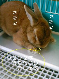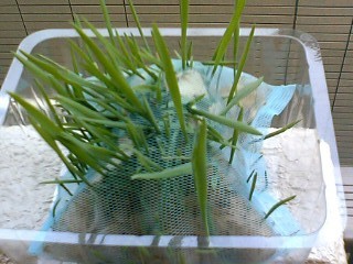 ものすごくボーボーに生えた「ごち草」くん。よ~く育ったんです。それはまさに大成功!梅雨時期でもなかなかいい育ちっぷりでしたよ。そして。待ちに待ったご試食タイム「やわらかいから食べやすいぞ。歯の少ない君にも大丈夫さっ!」「はい、どーじょ」(ママ) 結果・・・ やはり・・・ でもね、うちにはもう一人(一匹)こんな時に頼りになるエースがいるの・・・「な~んでも食べちゃうんですよ。ぼくしゃん」(も)ということで、「ごち草」君の行き先は「もんじ」のお腹に変更されました。家では「お○カさん扱い」の もんじ。最近買い換えた新しいがあんまり好きじゃないみたいで朝はほとんど食べません。それを心配した○○さん・・・「もんじぃ~(なんだか妙にやさしい口調。)ゴハン食べないとしんじゃうぞ~」 そこで私のつぶやき・・・。「たぶんさ、ポコがそんな風に言われたら ”えっ?ごはん食べないと死んじゃうでしゅか?じゃあ、一生懸命たべましゅ”(ガツガツ・・・)。。。と。でもさ、もんじだとさ~ ”え?死んじゃうってな~にぃ?(アハアハ)”・・・だろうね。」いかに、もんじが我が家で お○カ扱いかがお分かりになりますか??朝小食な割りに夕方からの「飯くれ~」コールはすごいです。決して具合が悪い訳じゃないんですよね。。。なんたって草食べちゃうくらいですから。こんな感じで我が家の「うさぎ」と「いぬ」のバランスが取れているのかも。
