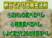 先日の日曜日「発掘!あるある大辞典2」を見ていたら・・・納豆がダイエットに良いというではありませんか~このお正月・・いえいえ、昨年秋~今の時期にかけてなんとな~く食べ続けちょっとやばい?と思い始めていたときに見た番組納豆キライじゃないし、安いし~テレビで見たところ2週間で平均3キロ減の方たちばかり。これはちょっと試してみちゃお~。ってことで今週月曜日から食べてます。一応コレがお約束。みたいです。ただ、どんな食べ方でも良いわけではなく熱を加えるとダイエット効果には結びつかないらしいので調理したものに混ぜて食べるのがいいのかと思われます。(私は今のところ普通にしか食べていませんが。)血液もサラサラになり肌年齢も若くなるらしい。。。最低2週間はやらないとだめみたいです。(1週間頃から効果が見える人もいるとか。)食事の最初に食べると結構お腹いっぱいになるような???気がします。とりあえず2週間やってみよう・・・・すると・・・なんとなく・・・この方が・・・・納豆に見えなくも・・・・・・・ない???「ボクは糸でましぇんよ」(ポ)・・・・・・・・・・・・失礼しました・・・・・・・・・・・・・