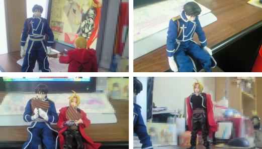 ~ロイエド愛の劇場~1:大佐「昨日はバレンタインなのに鋼のから何も無いなんて・・・・」(泣) 2:エド「たぁ~いさ!昨日はごめん渡したかったのに遅れたな」 大佐「鋼の・・・・?」 エド「そんなところに座ってないで起てよ!」 3:エド「これ、予約してたんだけどその予約が一杯でさ・・・マジで遅れてごめん!」 大佐「いいさ君からこうして受け取る事ができたんだから」 エド「えへへっ・・・そんな大佐が・・・ゴニョゴニョ・・・・」 大佐「ん?何だね?それよりこれ、二人で食べようじゃないか」 4:エド「えっ!いいの?」 大佐「二人で食べたほうがより美味しいじゃないか」 エド「ラッキー!俺、コレ一度食べてみたかったんだー!」 大佐「じゃココに座って・・・ほらほら口元が汚れてる・・・」 ・・・・・な~んていかがでしょうかね?ラブラブイチャイチャしていかにも馬鹿っプル状態ですが。ロイズのチョコポテチがきて家族で一袋あけましたwすぐなくなっちゃったけど甘ショッパさがミスマッチしててまいう☆まだ3袋手元にあり、私が大事に食べます(そして太る)フィギアってちょっとした漫画(?)までできて役にたっています。イラストは・・・はっきりって下手なので難しいマスタング大佐も動かせば何とかなる!ただ移りこんでしまう部屋の汚さは・・・目を瞑ってクダサイ・・・orz