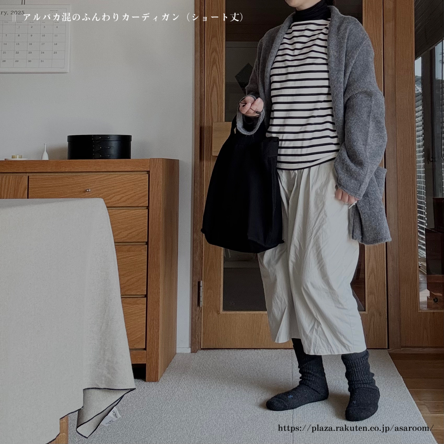 こんにちは今日も寒いですねお天気アプリの雨雲予報で「雨雲(雪)が近づいてます」ってきてる次の3連休は、さらに気温が低い予報が出てるよ花粉は舞いはじめてるっていうのに春はまだ遠そうですね北欧暮らしの道具店の新春SALEで買ってたふんわりカーディガン着画を撮る前に売り切れていたからなんとなく撮ってもブログにあげずにいたのだけどこのままだと載せ忘れてしまうのであげますネたしか同じ形でロングもあったと思いますが私はショート丈を選びました真冬の今はこれだけでは外に出られないけど私の色はないけどたぶんコレロングのこのコートを上に着て使ってますもう少しあったかくなったらコートの代わりに気軽に羽織って出かけようと思いますショートといってもおしりが隠れるくらいで羽織ると身体が包まれたようであったかいです(私の身長は157㎝)ネーミング通りのふんわり感さわっていてもとっても気持ちいい袖は長めなので家事をするときは袖をくるくる折り返して着ますそれもまたこなれ感が出て気に入ってますボタンもジーッパーも付いてないのも好きというか・・・手持ちの黒と紺のニットカーデもどちらも付いてないこういう形が私、すっきりとしてすきなんだと思うただこの形のデメリットとしてはずり落ちてきやすいこと肩の部分もドロップショルダーだしね留める部分があればずり落ちないのだけどずり落ちてくるのだけは気に入ってるこのカーデの唯一の不満点かなピンとかで留めることで対処はできると思うけどねこういう羽織る系のものが大好きでラプアンカンクリのショールも買おうか迷ってた時期もあったけどショールはさらにズリ落ちてきやすいと思いやめましたズリ落ちるって結構ストレスだよねそれにカーディガンの方が身体をすっぽり覆うからあったかいしね寒がりの私には向いてますカーディガンは、服の中でも私はとても長く着るのでコレってものを買うまで時間がかかります形や色や素材感。すべてが気に入るものがお安く買えて良かったですたぶん北欧暮らしの道具店の定番商品だと思うからふんわりカーディガン気になる方は来季チェックしてみてください♩〇 〇 〇 〇 〇ボーダーTシャツの下に着てるのはコレ年始だったかにユニクロで買ったカシミアブレンドタートルネックT(長袖)値下がっていてほとんどのサイズが今は売り切れ状態💦こちらもブログにあげるのが遅かったーーゴメンナサイ無印にも似たような商品があるのだけど※無印良品ネットストアより画像おかりしてます首まわりのフィット感がなさそうなのでやめましたゆるっと着たかったり、折り返して着るのが好みの方は無印の方がいいと思いますユニクロのはMサイズでこんな感じ首からだらんと下がらないしかと言って苦しくもなくて良かった〇 〇 〇 〇 〇今季買ったかぐれの黄色のニット売り切れていたのが再入荷されてますおすすめなのでぜひ~~#40代ファッション最後まで読んでいただきありがとうございましたよんだよ~のしるしにあさちゃんの頭をぽちっと応援クイックお願いします♩↓↓にほんブログ村いつもありがとうございますブログで紹介した商品まとめてます覗いてみてください↓↓Instagram(@pomeasaroom)↓↓ こちらもフォローいただけるとうれしいです