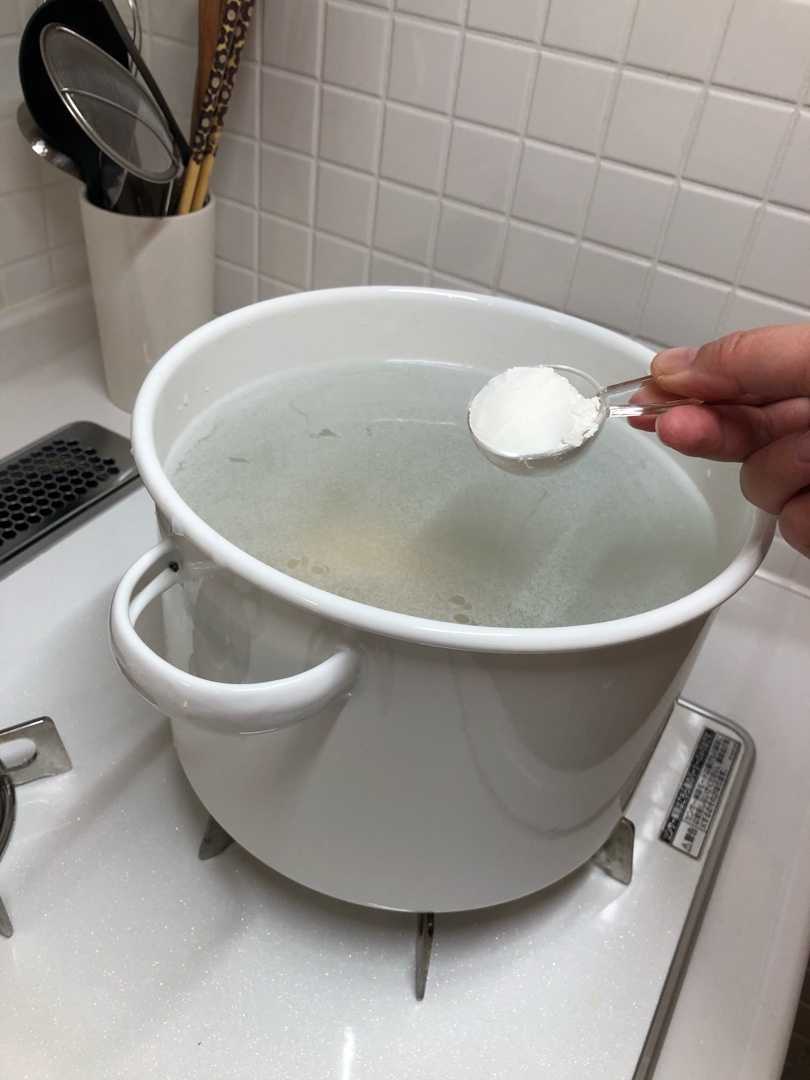 器が入るお鍋に米の研ぎ汁を器がかぶるくらいまで入れて弱火で20分ほど煮沸