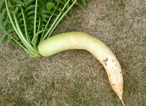 こんばんは。今日は朝から久しぶりの雨でした。菜園には恵みの雨です。先週末、大根が次々収穫出来ました。まっすぐに育つのはまれで、大半が曲がったり、横向きに伸びたりしています。今回の大根も曲がったもの、大きいです。今晩は、この大根を使って前から計画の大根餅なるものを作ってみました。大根餅とは中国料理の点心の一種で、本来の作り方はなかなか面倒なようですが、今回は みんなの今日の料理のサイトを参考に簡単な方法で作ってみます。まずは材料のご紹介です。おろし大根 4-5センチ分きざみネギ 1本分白玉粉(だんご粉)50-100g干しエビ (水に戻してきざんだもの)少々塩 一つまみ です。おろし大根に干しエビ、きざみネギ、塩一つまみを加え、耳たぶ程の硬さになるよう白玉粉を適量加えました。今回は大根の水分が多く、白玉粉がかなり必要でした。これを4等分し、平らな円形にして、フライパンに油をひき、両面をふっくらと焼き上げ、お皿に盛りつけます。フライパンに麺つゆ(2倍濃縮)大さじ3と水大さじ2、ゴマ油大さじ1を加えて煮立たせます。これを焼いたお餅の上にかけました。上から白髪ねぎ少々、スライスしたトウガラシを乗せて出来上がりです。ふっくらとした大根お餅、なかなかの味です。大根の味がほのかにして、美味しく頂きました。お餅料理が食べたくなった時の新しいレパートリーです。Kei