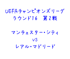 サッカー観戦DAZN観戦ファーストレグで勝っているシティは優位マドリーはこの試で勝ち上がために最低2ゴールが必要でしたが、マドリーのディフェンスラインのパス回しにプレッシャーを掛けシティが奪うとスターリングが決めて先制それでもロドリゴのクロスにベンゼマがヘッドで決めて同点マドリーが巻き返しを見せるベンゼマ中心にチャンスを作るも決めきれずにいるとバックパスをジェズスに拾われシティが追加点試合を決定づけるゴールこれでさらに2ゴールが必要になったマドリーでしたがシティは落ち着いて対応しこのまま終了2試合合計4-2でシティが準々決勝進出を決めました。↓ランキング参加中 クリックお願いします!サッカーランキング今年のサッカー観戦記録↓サッカー観戦 2020年記録UEFAチャンピオンズリーグ ラウンド16 第2戦マンチェスター・シティ×レアル・マドリード2-1