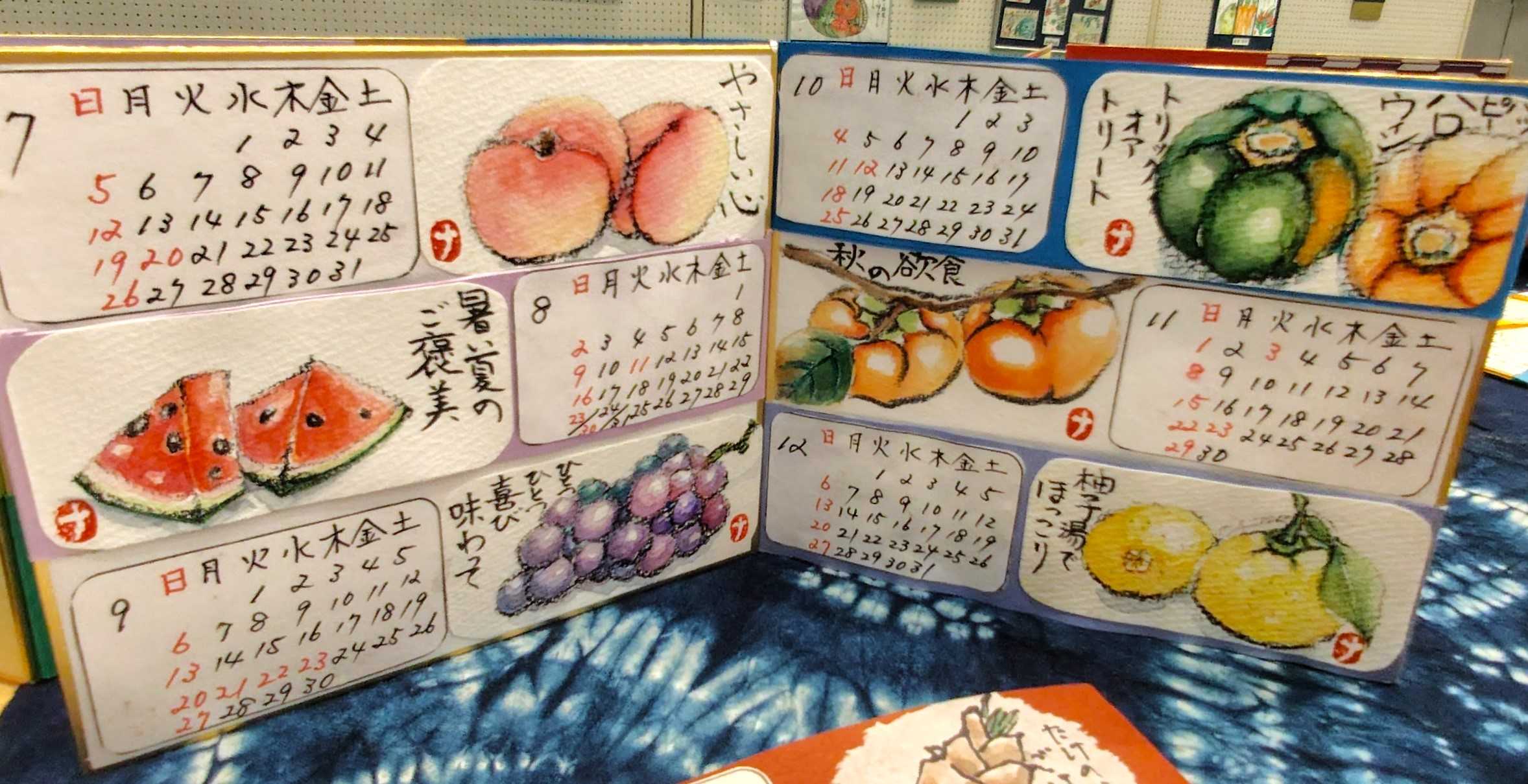 折りたたみ暦「からくりカレンダー」も手作りして展示しました。見た目は表紙と裏表紙だけの卓上カレンダーですが、左側から開くと1月~6月の暦が現れ、右側から開くと7月~12月が現れる仕掛けとなってます。