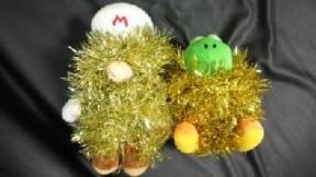 クリスマスツリーの飾り用のキラキラ、どこいったかな~?とさがしていたら、おもちゃの箱に入ってたのだけど…ん?なんだこりゃキラキラが巻いてあるこれは…?この鼻、この帽子、緑の頭…そう、スーパーマリオの「ファイヤーマリオ」と「ヨッシー」のヌイグルミでした。どうやら三男の仕業。何だかこの巻き方がかわいくてつい写真に撮ってしまいました。親ばか~