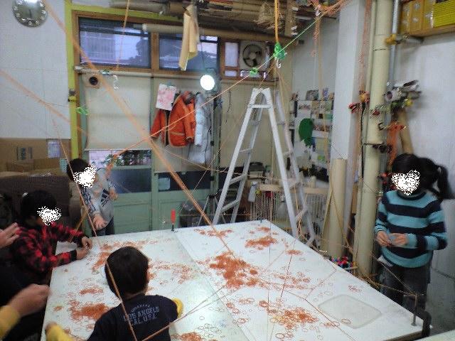 今日の午後、車で二時間弱かけて、世田谷の「深沢アート研究所」に行ってきました。http://www.hukalabo.com商店街の中にあるアトリエで、中に入ると、工具や材料、画材類がびっしり。入っただけで、ワクワクする空間ですここをやっているカブさんは先輩で、山添さんと一緒に造形教室をやっていたのは、何年も前から知っていたのですが、今回、はじめてオジャマしてきました。今日は輪ゴムを一個一個をつないでいって、ながーくして、それをひっかけて、アトリエ全体を作品にしていきました。みんな夢中です。どんな空間になるんだろう。。。ひっかけ終わったら、今度は紙で好きなように絵を描いていきます。そして、その絵を輪ゴムでとめていきます。動物たちのサーカス です。息子も参加してきましたが、大喜びでずっとしゃべりっぱなし。スパイダーマンを描いて悪者と戦っている絵を描いていました。こーんな上のところにニコニコした人が。高いところに行って、嬉しがっているんだってあっという間に時間が過ぎ、制作終了。お掃除をみんなでして、みんなでお茶の時間なんだか、とってもよい感じですお迎えがきて、みんなそれぞれ親御さんに何をしたのかの報告。みんな楽しそうに報告していましたそのあと、私は カブさんと山添さんにいろいろお話を聞いたり、相談させてもらいました。帰りは23時。。。東村山から世田谷は遠い。。。でも帰りの環八はス~イスイいけたので、疲れなし。世田谷のよい風をもらったので、土曜日はニコニコ楽しみましょうカブさん、山添さん、造形教室のみなさん、ありがとう!