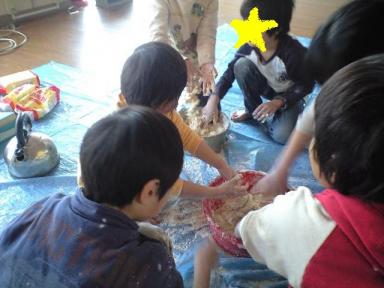 今日の造形教室は、小麦粘土をつくりました~みんな最初は結構、オソルオソル触ってましたが、そのうち、こういう感じに粉の感触が、きもちいい~!といってました。こねこねこね、なかなか大変な作業。。。でも、「スリッパ!」とか言って、みんな遊びながら、粘土にしていきました。青、赤、黄、緑、白の5色の粘土をつくりました。また、実験!といって、全部の色を混ぜてみたりしました。そのあと、それぞれ好きな形につくっていきました。いろいろな車、棒を立てて船みたいな形、伝説の動物‘つちのこ’、ケーキ、なぞの形などなど。。。みんなたくさんつくりましたその後、お掃除!!みんなで雑巾がけレースをして、一休み。お茶の時間ですほっと一息ついて、片づけをして、「さようなら」の挨拶。今回、お手伝いをしてくれた皆様、本当にありがとうございました。無事に終わる事が出来て、本当によかったです。4月からは月に2回です。参加されたい方はまだ空きがありますので、メッセージくださいね