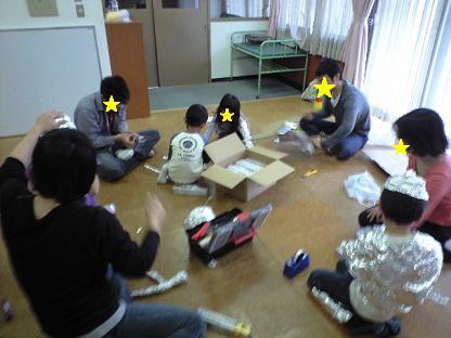 5月15日のあそび山は、第4土曜日の予定を変更して、行いました。まず、みんなでダンボールを使って、体全体を動かすワーク。ダンボールというだけで、子供達はなぜかワクワクするようです。みんなで、大きなダンボールに入り競争したり、横にしてキャタピラレースをしたり、大いに盛り上がりました。始まる前までキンチョウしていた初めて参加の体験の子もここで一気に打ち解けていったようです。そして、次にアルミホイルを使って、衣装や身に着けるものをつくりました。今回はパパの参加が多い日でした。パパも面白いものをいっぱいつくっていましたよ!つくりながら遊び、つくったあとも遊び、今回は少人数でしたが、とてもにぎやかでした。最後につくったものを身に着けて、ハイポーズ!今回も皆様、ありがとうございます。次回は、6月12日土曜日 13時~です。ちょっと日にちがあきますが、よろしくおねがいします。それでは!