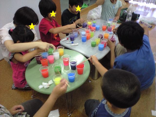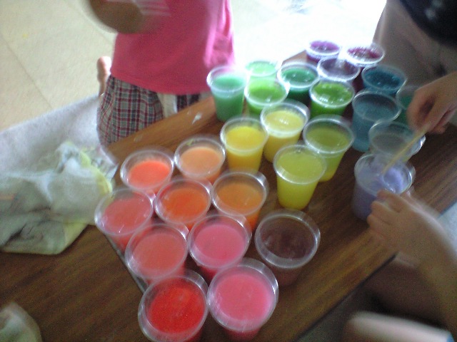 今日は、七夕ということで天の川をプルプルのスライムでつくりました。まず、赤、青、黄、白のみでひとり七色の色水をつくりました。ホウ砂水を入れ、ぷるぷるのスライムに。この混ぜていく感覚がおもしろいです。液体からスライムになっていくとき、笑いがでます。このスライムを並べてみました。にじいろ!さぁ、このスライムで天の川をつくろう!ひとつひとつ、スライムを流していきました。にじいろの天の川みたい!アルミホイルでつくった星を浮かべました。このあと、スライム風船にトライ!そして、自由に遊ぶ時間!スライム足湯として、足を突っ込む人、塩を入れて、固めていく人、ひたすら感触を楽しむ人、、、、最後の方は、スライムの色が混ざりすぎて、すごい色に、、、、この他、ナイスショットな写真を何枚も撮ったのですが、あまりにすごい色なので、控えます。。。今回も、ありがとうございました!次回の土曜チームは21日です。木曜チームは、12日です。振替の人は、お早めに連絡くださいね!参加希望の方は、お早めに体験からお申し込みください。土曜日は、もう少しで締切ります。木曜日は、まだまだ大丈夫です!お申込みは下記まで☆☆☆☆☆☆☆☆☆☆☆☆☆☆☆090-3536-4793 (平日は19時から21時まで)i-haru3711@ezweb.ne.jpあそび山の連絡係り:イワマさんまで☆☆☆☆☆☆☆☆☆☆☆☆☆☆☆皆様のご参加をお待ちしております。 造形アトリエあそび山 橋本加奈子 080-5191-0094