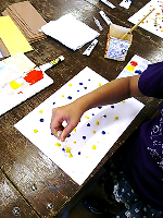今年度から、水曜日チームも開講することができるようになりました! ありがとうございます 4月一回目の土曜日の様子を報告します。 まずは、色水つくりをしました。 そのあと、スプレーでシュッシュッと絵の具を吹いたり、指を使って指紋ハンコウのように押したり、自由に色あそびをして、 乾燥… その間、シールを手作りしました。 乾いたら、さきほどの画用紙に切り込みをいれ、絵本に! つくったシールをはったり、描き込んだり、お話しをその場で考えてつくりました。 ひらめき絵本の完成です! 偶然と思い付きとひらめきの絵本 みんなの集中力、すごかったです! 今回も ありがとうございました